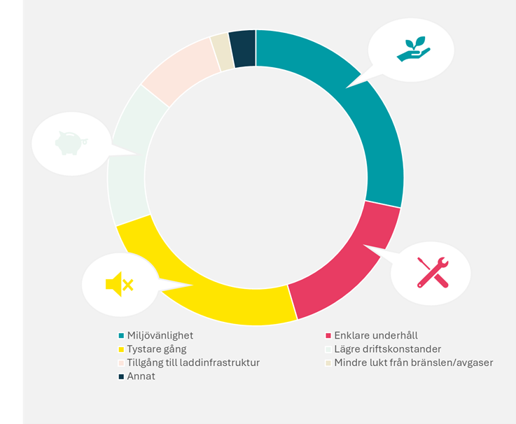 Hele 28 prosent oppgir at miljøvennligheten til elektrisk fremdrift er hovedgrunnen til å kjøpe eller konvertere til en elektrisk motor. Nesten like mange (25 prosent) fremhever stillere drift , mens enklere vedlikehold (17 prosent) og lavere driftskostnader (16 prosent) også spiller en stor rolle.